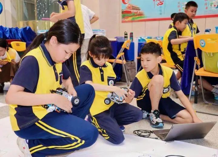在“机器人绘画”项目中,小选手们精心设计程序指令,形态各异的自主移动机器人按设定程序,在画纸上精准描摹出规定的几何图案,编程逻辑和“几何艺术”在此刻完美交融。